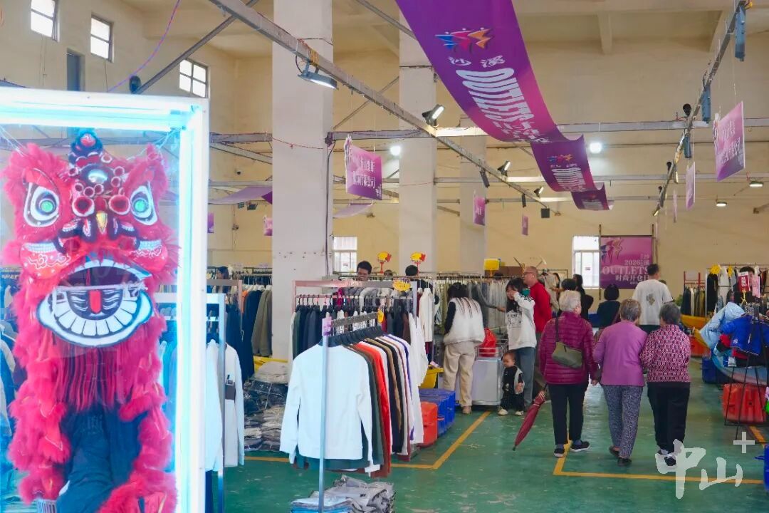 走進圣獅村糧倉內(nèi),斑駁的老磚墻下,通偉、俊怡等15家沙溪本地服裝企業(yè)的服飾攤位一字排開,折扣標(biāo)牌十分醒目。攤位上除了應(yīng)季冬裝外,夏秋款服飾一應(yīng)俱全,不少消費者駐足挑選。“來村里逛一圈,順便就把衣服買了,一舉兩得!”游客李小姐笑著說。