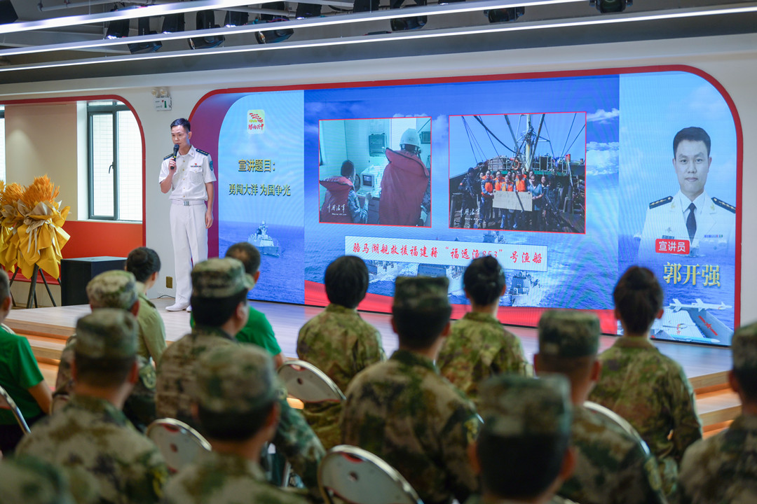 郭開強(qiáng):勇闖大洋 為國(guó)爭(zhēng)光 2008年12月,應(yīng)聯(lián)合國(guó)授權(quán)請(qǐng)求,奉中央軍委命令,南海艦隊(duì)武漢艦、??谂?、微山湖艦組成第1批護(hù)航編隊(duì),拉開了人民海軍舉世矚目的亞丁灣、索馬里護(hù)航序幕,這是自600多年前鄭和下西洋以來,中國(guó)真正意義上的遠(yuǎn)海非戰(zhàn)爭(zhēng)軍事行動(dòng),開啟了人民海軍從“黃水”駛向“藍(lán)水”的壯麗航程。 91878部隊(duì)郭開強(qiáng)干事為大家?guī)碇黝}宣講《勇闖大洋 為國(guó)爭(zhēng)光》。 郭開強(qiáng)介紹—— 迄今為止,人民海軍已累計(jì)派出44批100余艘次艦艇參加亞丁灣、索馬里海域護(hù)航,完成1500多批7000余艘中外船舶護(hù)航任務(wù),解救、接護(hù)各類船舶近百艘,其中外國(guó)船舶超過50%。 護(hù)航官兵一次次直面生死、一次次化解危機(jī)、一次次挑戰(zhàn)極限,用忠誠(chéng)與奉獻(xiàn)、責(zé)任與擔(dān)當(dāng),彰顯大國(guó)海軍形象,譜寫了人民海軍邁向世界一流海軍的新時(shí)代壯歌。 張長(zhǎng)城分享軍旅故事。記者 易承樂 攝