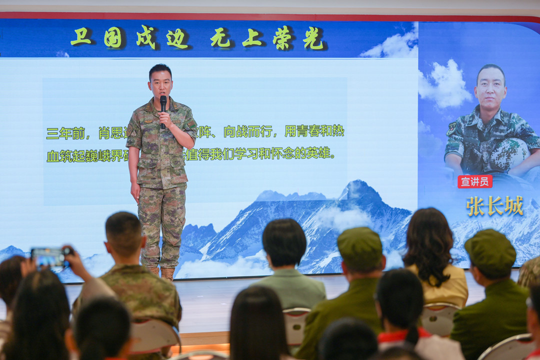 張長(zhǎng)城:肖思遠(yuǎn)的名字永遠(yuǎn)留在連隊(duì) “我是69316部隊(duì)加勒萬邊防連‘肖思遠(yuǎn)班’班長(zhǎng)張長(zhǎng)城,很高興今天有機(jī)會(huì)跟大家進(jìn)行交流。三年前,肖思遠(yuǎn)班長(zhǎng)兩闖敵陣、向戰(zhàn)而行,用青春和熱血筑起巍峨界碑,是永遠(yuǎn)值得我們學(xué)習(xí)和懷念的英雄……” 張長(zhǎng)城現(xiàn)場(chǎng)作了主題為《衛(wèi)國(guó)戍邊 無上榮光》的宣講。 張長(zhǎng)城說—— 肖班長(zhǎng)犧牲后,連隊(duì)組建了“肖思遠(yuǎn)班”,班里有一張肖班長(zhǎng)的床,每天晚上,戰(zhàn)士們都會(huì)將肖班長(zhǎng)的被子打開,早上起床再將被子工工整整的疊好;晚上點(diǎn)名,班里的同志輪流向肖班長(zhǎng)匯報(bào)本班和個(gè)人的工作。 連隊(duì)每天的點(diǎn)名,呼點(diǎn)的第一個(gè)名字永遠(yuǎn)是“肖思遠(yuǎn)”,全連齊聲答“到、到、到”,那一刻,感覺下面所有人,望過去都是他! ▌與現(xiàn)場(chǎng)基層干部群眾互動(dòng)交流