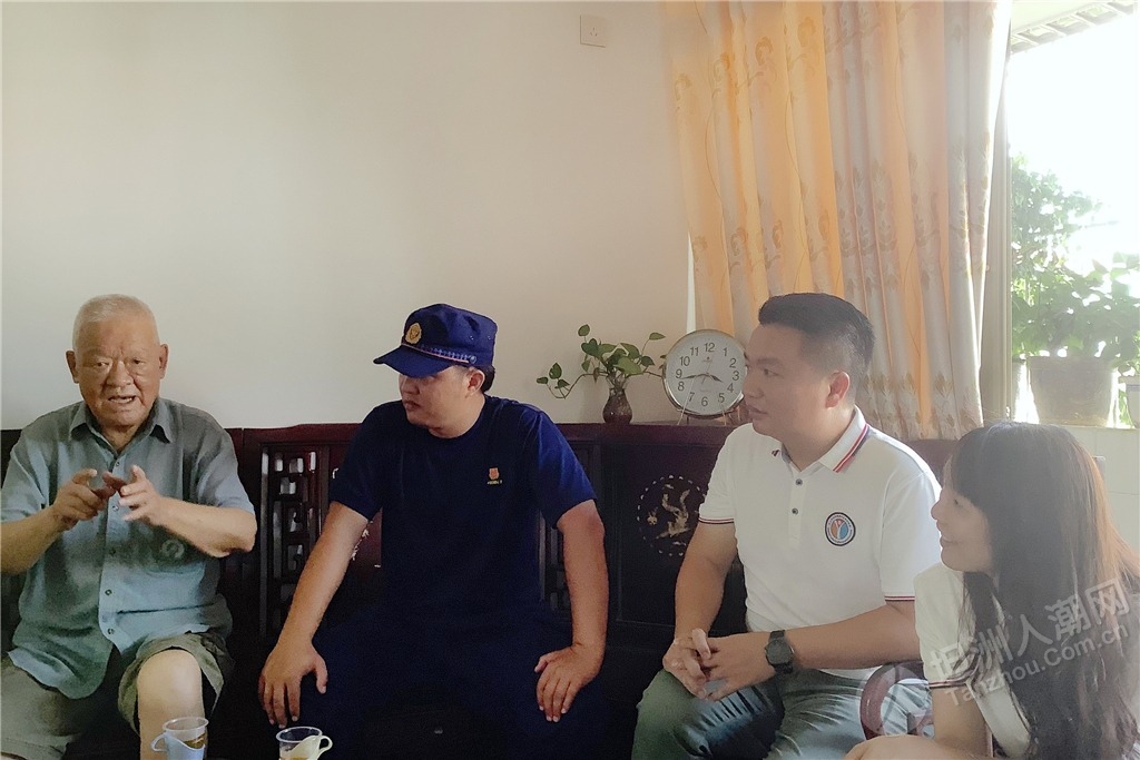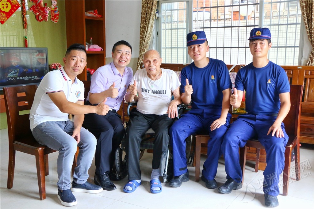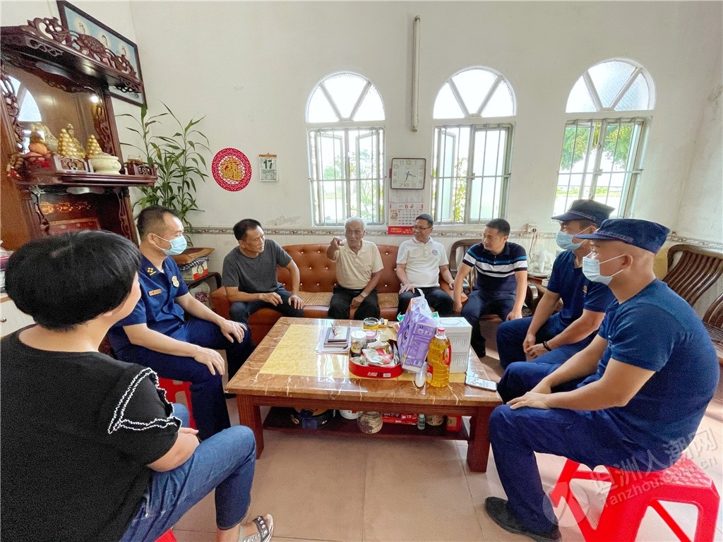 隨后,慰問組還邀請(qǐng)參戰(zhàn)老兵鄭金洪走進(jìn)中山市消防救援支隊(duì)坦洲大隊(duì)講述革命故事,給與會(huì)黨員干部和部分基干民兵送上了一堂生動(dòng)、鮮活的紅色教育黨課,讓全體人員感受參戰(zhàn)老兵的精神洗禮?!霸谝淮尾筷?duì)作戰(zhàn)時(shí),我和另一名貴州籍的戰(zhàn)友去攻打一個(gè)火力點(diǎn),我們一起在山腳的一塊石頭處掩護(hù),但根據(jù)我以往的作戰(zhàn)經(jīng)驗(yàn),我覺得這里不安全,于是趕緊對(duì)他說不要待在那塊石頭那,也不要站立,趕緊滾到下面的公路去;好在他聽從我的命令后,迅速地做出反應(yīng)。當(dāng)我們到達(dá)安全地方時(shí),長(zhǎng)舒一口氣,一直聽到有子彈嗖嗖嗖地從那塊石頭附近穿梭而過;而那位戰(zhàn)友感慨地跟我說‘班長(zhǎng),好在你迅速做出反應(yīng),不然我在那不是受傷就是死了?!编嵔鸷橐杂H身經(jīng)歷聲情并茂地向大家講述了當(dāng)年戰(zhàn)火紛飛的戰(zhàn)斗經(jīng)歷。 ▲慰問組一行聆聽烈士遺屬陳北根講述他父親生前與敵斗爭(zhēng)的英雄故事。