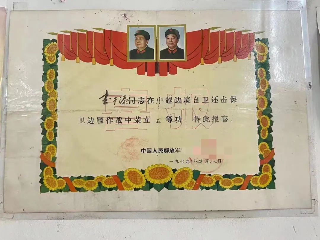 李干添對(duì)慰問(wèn)組的到來(lái)表示感謝,并拿出參戰(zhàn)時(shí)期立功的勛章和喜報(bào)共同回憶戰(zhàn)爭(zhēng)年代。