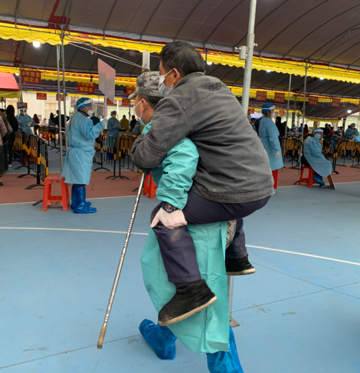 在小欖鎮(zhèn)聯(lián)豐社區(qū)核酸檢測采樣現(xiàn)場,退役軍人吳鴻文背起一位行動不便的老人前往核酸采樣工作臺,采樣結(jié)束后,將老人送出場外。臨走的時候老人連聲向他道謝。