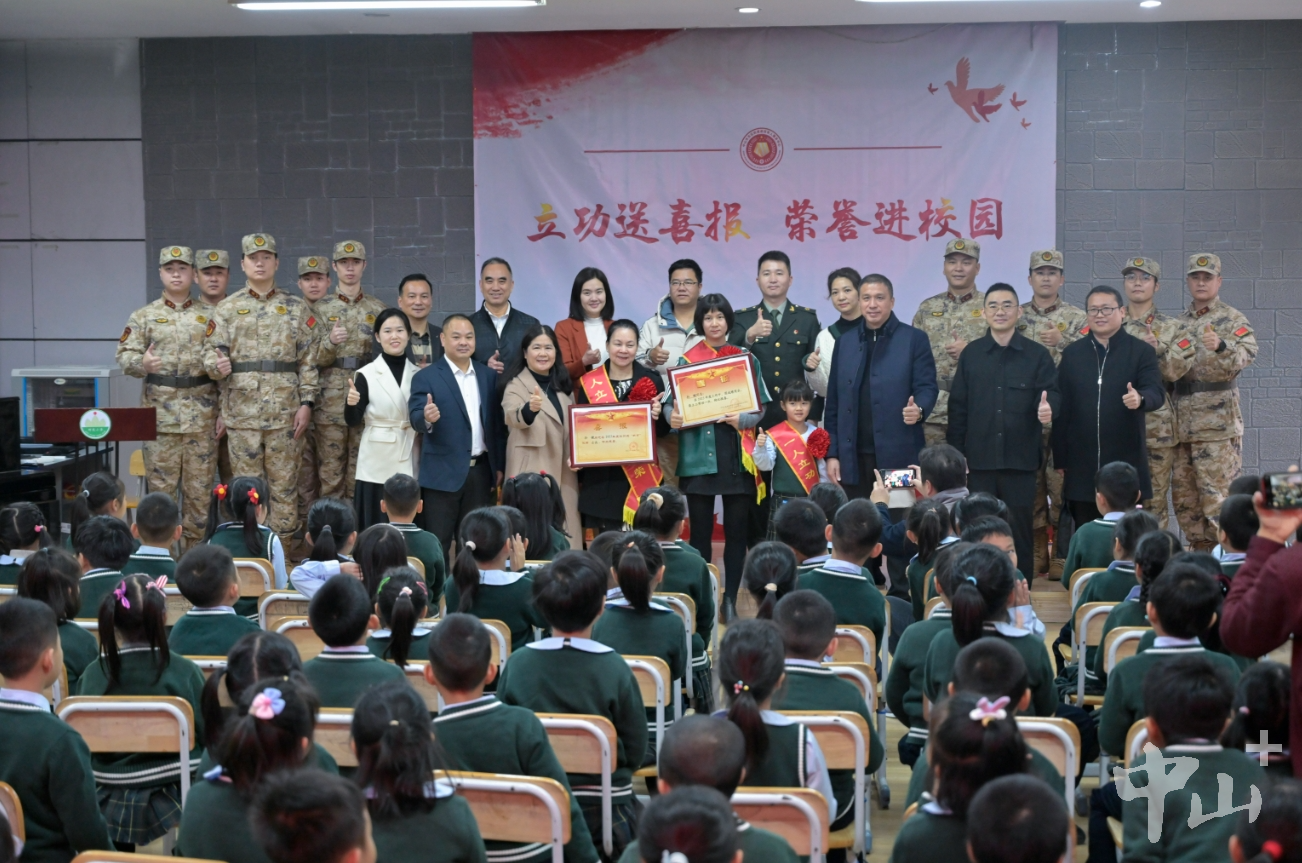 拉橫幅、敲鑼鼓、舞龍獅……2月29日一早,東區(qū)街道竹苑社區(qū)迎來了一支敲鑼打鼓、舞龍舞獅的隊(duì)伍,一路喜氣洋洋,熱鬧非凡。游行隊(duì)伍將一份立功受獎(jiǎng)的榮譽(yù),帶到了榮立三等功的現(xiàn)役軍人孫鍵女兒孫頌雅所在的竹苑小學(xué),熱鬧的場(chǎng)面吸引許多鄉(xiāng)親、商戶等前來圍觀祝賀。 聯(lián)合送喜報(bào),儀式感拉滿 校園內(nèi),在讀小學(xué)一年級(jí)的“軍娃”孫頌雅和她的同學(xué)、老師等共同見證了這一榮耀時(shí)刻。東區(qū)街道黨工委書記周俊峰將三等功喜報(bào)送到孫頌雅一家人手上,市退役軍人事務(wù)局黨組成員、副局長(zhǎng)陳光林為他們送上慰問金,并為其佩戴光榮綬帶“一人立功,全家光榮”,一家人臉上洋溢著開心且自豪的笑容。  孫頌雅一家人在學(xué)校收到立功喜報(bào)。記者 易承樂 攝