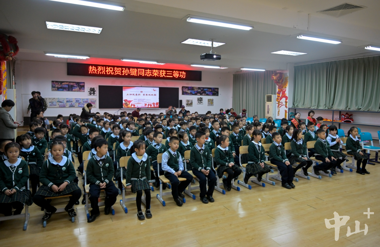 喜報(bào)一頭連著軍心士氣,一頭系著軍屬情懷?;顒?dòng)現(xiàn)場(chǎng),榮立三等功的現(xiàn)役軍人孫鍵通過視頻向女兒說出心里話:“我最親愛的女兒頌雅,爸爸多么想陪伴在你的身邊,每一個(gè)節(jié)假日,每一天,看著你慢慢地成長(zhǎng)。但是天下雖安,忘戰(zhàn)必危。國(guó)無防不立,民無兵不安,爸爸要保家衛(wèi)國(guó)。我的女兒,希望你理解和體諒爸爸的不能陪伴。爸爸也曾經(jīng)是竹苑小學(xué)的學(xué)生,從這里走出去,走向祖國(guó)更需要爸爸的地方……” 據(jù)介紹,2014年起至今,孫鍵在中國(guó)人民解放軍某部隊(duì)服役,因表現(xiàn)突出榮獲“四有”優(yōu)秀士兵、榮立三等功。因常年在部隊(duì),孫鍵不能像其他孩子的父親那樣給予女兒更多關(guān)愛和陪伴,他們只能通過手機(jī)交流。 孫鍵的妻子郭麗說:“丈夫從小就想當(dāng)兵,大學(xué)畢業(yè)后他選擇參軍報(bào)國(guó),我們一直默默支持他。今天的儀式太隆重了,我平時(shí)很少跟女兒講爸爸的工作到底是什么,孩子的性格有點(diǎn)內(nèi)向,爸爸想讓女兒在學(xué)校過得更開心,更開朗一些?!?/p> 開展紅色宣講,愛國(guó)主義教育進(jìn)校園 記者現(xiàn)場(chǎng)看到,活動(dòng)還邀請(qǐng)了“中國(guó)好人”、東區(qū)街道退役軍人紅旗志愿服務(wù)隊(duì)隊(duì)長(zhǎng)李克為大家上了一堂生動(dòng)的愛國(guó)主義教育課,并將移動(dòng)軍旅展覽館帶到校園,通過紅色宣講和軍旅物品展示,把愛國(guó)情懷厚植于小朋友們幼小的心靈中。  為孩子們上愛國(guó)主義教育課。記者 易承樂 攝