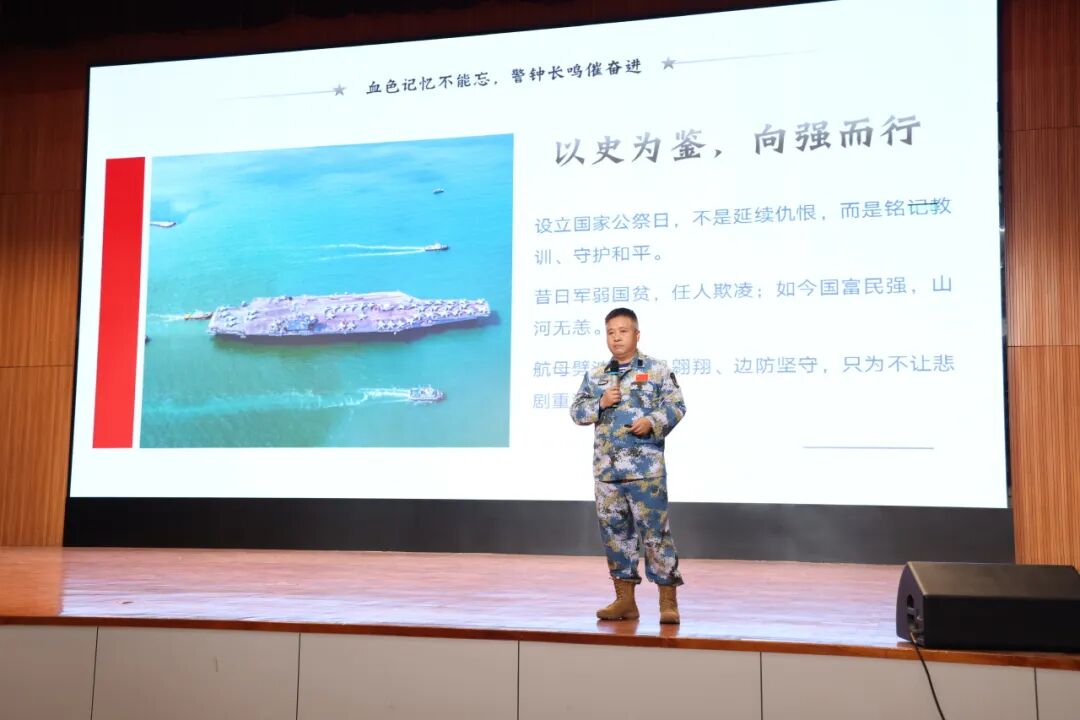 活動邀請中山港口鎮(zhèn)人民武裝部副部長賀洪彪以《銘記歷史守海疆 青春立志報家國》為題開展專題講座,帶領(lǐng)師生重溫南京大屠殺那段山河破碎的屈辱歷史,闡釋國家公祭日的設(shè)立意義,讓師生深刻理解“銘記歷史、勿忘國恥”的意義?,F(xiàn)場莊嚴(yán)肅穆,全體師生為南京大屠殺死難同胞默哀,用無聲的敬意寄托對逝者的哀思。 會上,賀洪彪結(jié)合自身十五載南沙守礁經(jīng)歷,講述“以礁為家、以苦為榮”的崢嶸歲月,用軍人的忠誠與信仰,詮釋新時代國防衛(wèi)士守護(hù)家國的責(zé)任擔(dān)當(dāng),讓師生們真切感受到和平生活的來之不易。