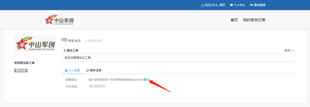圖4 03 登錄信息 注冊(cè)成功后自動(dòng)跳轉(zhuǎn)至登錄界面,填寫(xiě)相應(yīng)信息后登錄賬號(hào),進(jìn)入個(gè)人中心首頁(yè),將系統(tǒng)默認(rèn)郵箱更改為個(gè)人常用郵箱,方便大賽執(zhí)委會(huì)通知發(fā)送。如圖5-6所示: