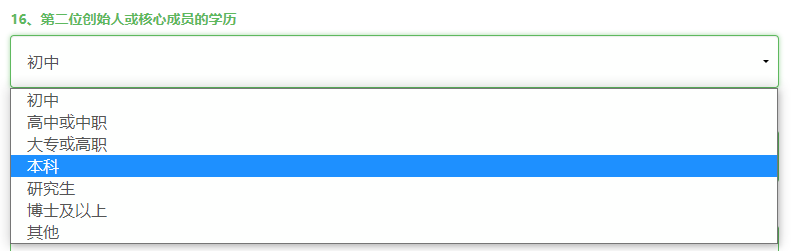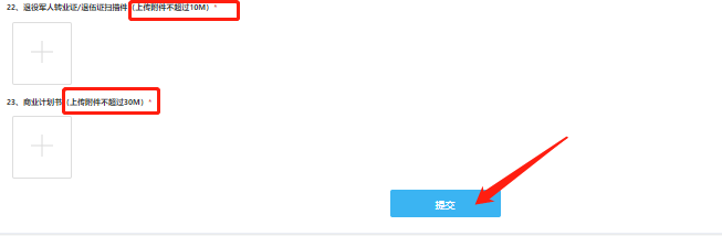圖10 07 填寫(xiě)報(bào)名表 學(xué)歷一欄系統(tǒng)默認(rèn)為“初中”,如需修改,點(diǎn)擊可跳出其他內(nèi)容選項(xiàng),按實(shí)際情況選擇即可。注意根據(jù)內(nèi)容提示填寫(xiě)相應(yīng)正確信息,有“*”標(biāo)志的為必填內(nèi)容,注意退役軍人轉(zhuǎn)業(yè)證/退伍證掃描件上傳附件不得超過(guò)10M,商業(yè)計(jì)劃書(shū)上傳附件不得超過(guò)30M。報(bào)名表所有項(xiàng)目?jī)?nèi)容格式須完全填寫(xiě)正確才可成功上傳。如圖11-12所示: