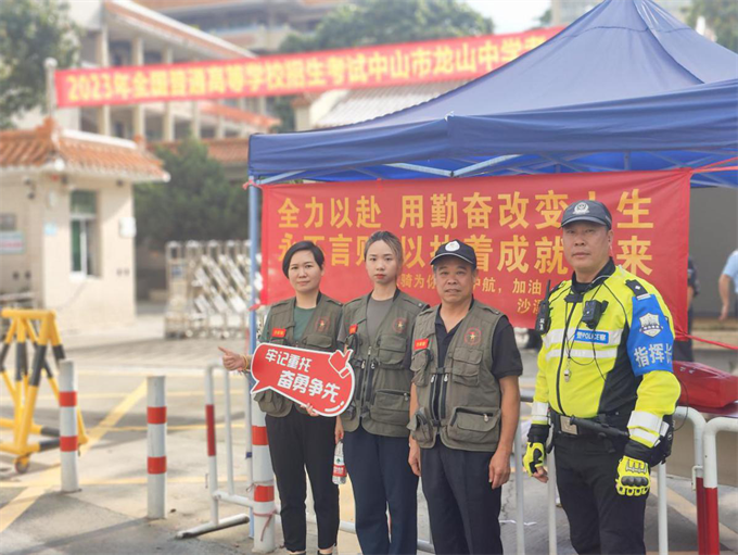 沙溪鎮(zhèn)退役軍人志愿者和民兵協(xié)助公安交警開展高考護航工作。 7日早上7時許,在沙溪鎮(zhèn)寶珠東路龍山中學路口,多名退役軍人紅旗志愿服務隊隊員和民兵協(xié)助公安交警在路口設立警戒線,做好交通疏導、公共秩序維護、卡點值守等服務,同時為考生及家長提供礦泉水、應急救援等服務,給考生營造一個安全、寧靜、有序、文明的考試環(huán)境。 在中山市桂山中學門口,三鄉(xiāng)鎮(zhèn)退役軍人志愿者和民兵按照事先分工安排,分散在各個交通路口,有的拉警戒線,有的指揮車輛通行,有的疏散人群,有的負責在助力點發(fā)放礦泉水,他們精神抖擻,干勁十足,積極協(xié)助公安民警,做好考場周邊交通秩序維護,確??荚嚻陂g考場周邊環(huán)境安靜有序。