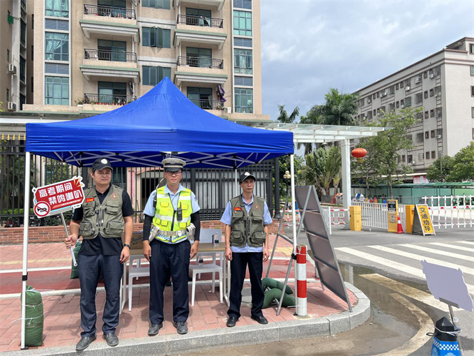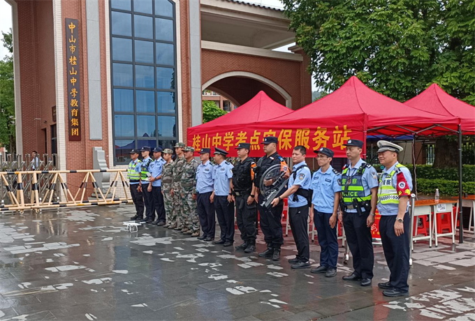 三鄉(xiāng)鎮(zhèn)退役軍人志愿者和民兵在桂山中學考場提供安保服務。