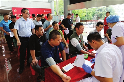 我市退役軍人踴躍報(bào)名參加無償獻(xiàn)血活動(dòng),大家正在接受獻(xiàn)血前血壓測(cè)量。記者 王云 攝