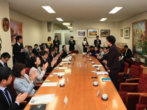 中山市教育考察團(tuán)成員向田上市長、馬場教育委員長展示中山市小學(xué)生作品