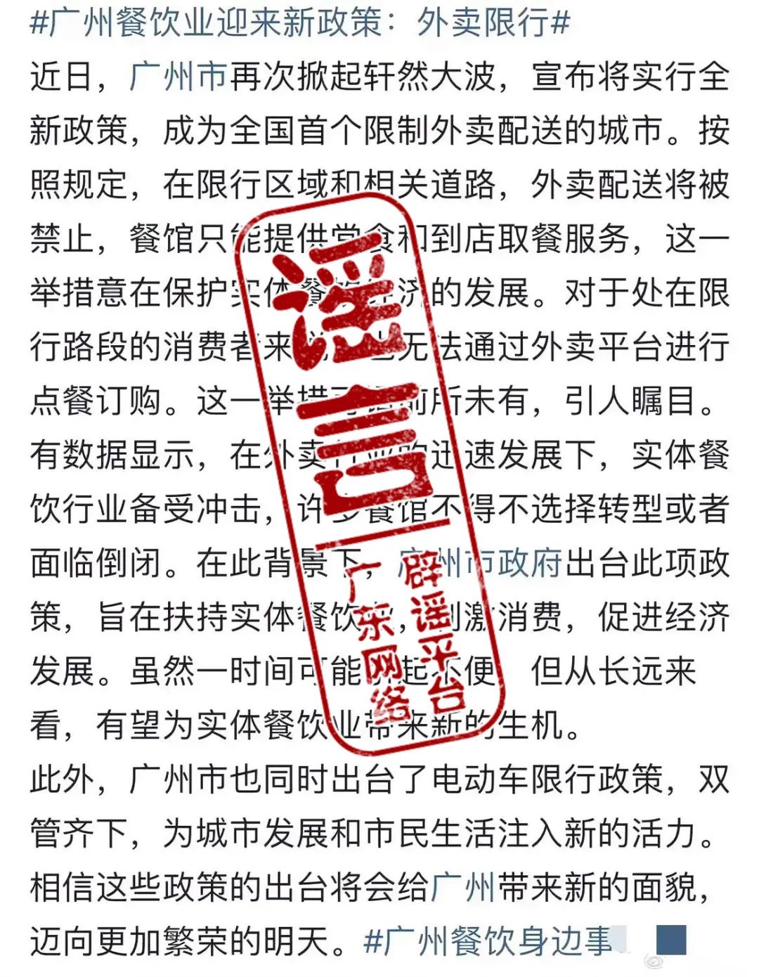 近日,有自媒體發(fā)布“廣州市將實(shí)行全新政策,成為全國(guó)首個(gè)限制外賣配送的城市”“限行區(qū)域和相關(guān)道路,外賣配送將被禁止,餐館只能提供堂食和到店取餐服務(wù)”,經(jīng)核查,上述信息嚴(yán)重不實(shí),惡意曲解廣州電動(dòng)自行車限行新規(guī),誤導(dǎo)民眾,引發(fā)不良社會(huì)影響。