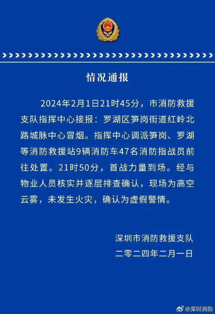 深圳市消防救援支隊(duì)指揮中心調(diào)派筍崗、羅湖等消防救援站9輛消防車47名消防指戰(zhàn)員前往處置。21時(shí)50分,首戰(zhàn)力量到場(chǎng)。經(jīng)與物業(yè)人員核實(shí)并逐層排查確認(rèn),現(xiàn)場(chǎng)為高空云霧,未發(fā)生火災(zāi),確認(rèn)為虛假警情。
