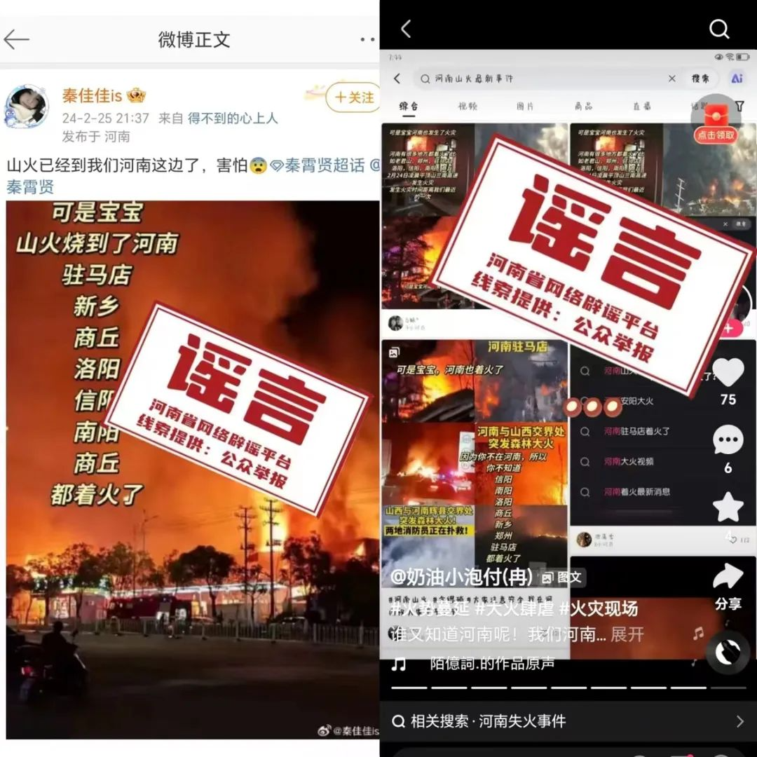 近日,微博用戶@秦佳佳is、視頻平臺用戶奶油小泡付(冉)等賬號發(fā)布“山火燒到了河南”信息,并配上多張火災(zāi)圖片。經(jīng)河南省網(wǎng)絡(luò)辟謠平臺向省林業(yè)局等相關(guān)部門核查,截至2月26日,河南省域內(nèi)未發(fā)生山火,網(wǎng)傳信息為謠言。請廣大網(wǎng)民不信謠、不傳謠。