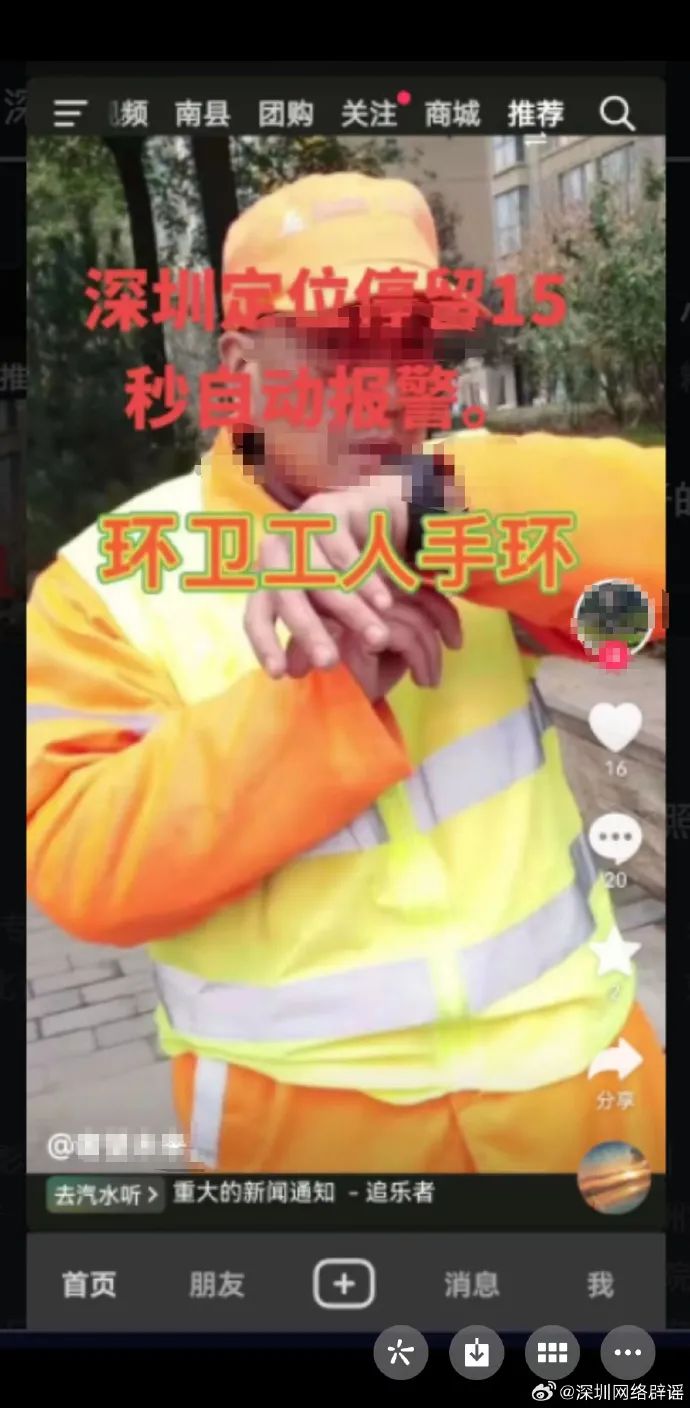 近日,網(wǎng)傳“深圳環(huán)衛(wèi)工人佩戴的定位手環(huán)停留15秒后將自動報警”,記者從深圳市城市管理和綜合執(zhí)法局了解到,該情況不屬實(shí)。傳言中圖片是2022年4月11日上傳的定位手環(huán)功能介紹視頻的視頻封面,于近日被添加了“深圳定位停留15秒自動報警”文字并上傳至新媒體平臺傳播,對深圳環(huán)衛(wèi)行業(yè)造成不良社會影響。