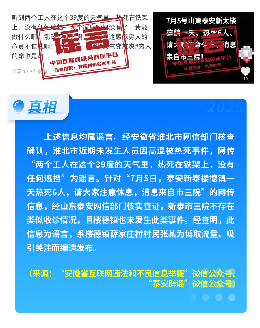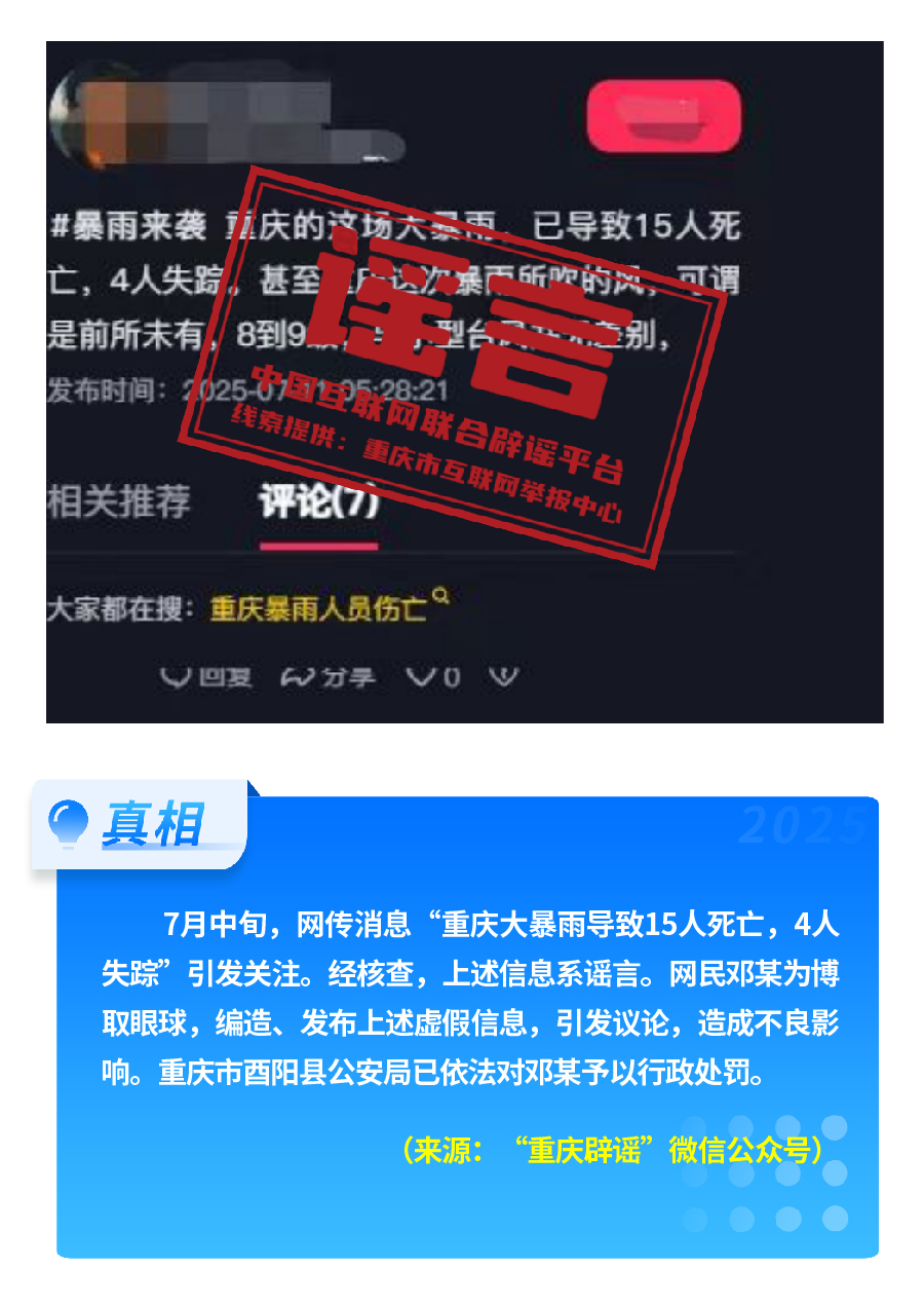 近期,網(wǎng)上接連出現(xiàn)發(fā)布虛假“警情通報”的惡性造謠傳謠案件,炮制傳播“昆明駕車撞人案131人死亡”“杭州自來水接入糞水”及涉釋永信虛假“警情通報”,模仿“藍底白字”格式,杜撰聳人聽聞細節(jié),損害政府公信力,嚴重擾亂社會秩序?!霸菏款A(yù)測廣東將發(fā)生8級以上大地震”公然偽造專家聊天截圖,謊報地震預(yù)警。還有造謠者借盛夏高溫酷暑與洪澇災(zāi)害,編造“安徽淮北、山東泰安等地多人因高溫死亡” “重慶大暴雨導(dǎo)致15人死亡、4人失蹤”等謠言,蹭炒熱點、煽動情緒。