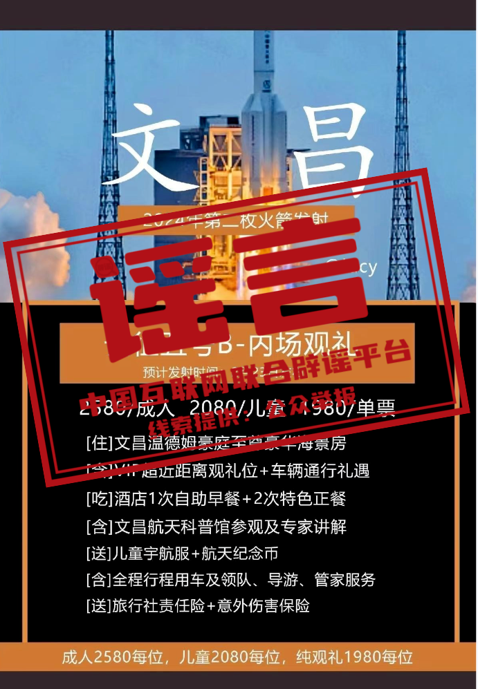 辟 謠  售賣“文昌航天發(fā)射場(chǎng)內(nèi)場(chǎng)火箭發(fā)射觀禮門票”系虛假宣傳