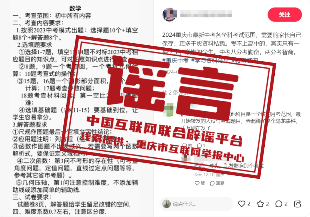 真相:近日,有網(wǎng)民發(fā)布2024年重慶中考各學科“考查范圍、考查內容要求、試卷要求和難度系數(shù)”等信息,引發(fā)關注。經(jīng)核實,重慶市教育科學研究院有關研討會尚未召開,且會前未發(fā)布任何有關中考各學科命題信息。重慶市教育科學研究院表示,網(wǎng)上傳播的各學科“考查范圍、考查內容要求、試卷要求和難度系數(shù)”等內容均為虛假信息。(來源:重慶辟謠)