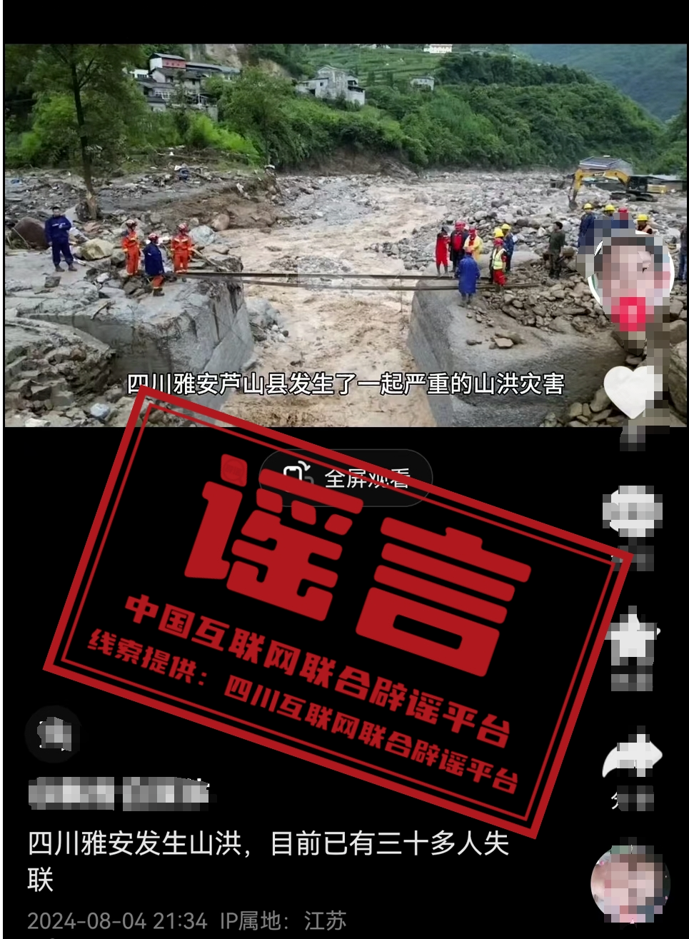 真相:近日,有網(wǎng)民發(fā)視頻稱,四川省雅安市蘆山縣發(fā)生一起嚴(yán)重的山洪災(zāi)害,目前已有三十多人失聯(lián)。經(jīng)當(dāng)?shù)鼐W(wǎng)信部門核實,蘆山縣近日未發(fā)生山洪災(zāi)害,也無人員失聯(lián)等情況。請廣大網(wǎng)民從官方渠道獲取權(quán)威信息,對于網(wǎng)絡(luò)來源不明信息,不得隨意轉(zhuǎn)發(fā)或發(fā)布。(來源:四川互聯(lián)網(wǎng)舉報辟謠平臺、蘆山融視聽)