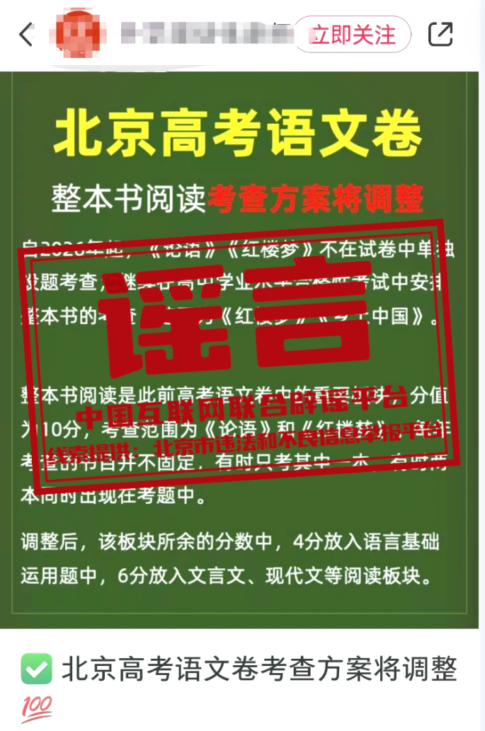 真相:近日,關(guān)于“北京高考語文學(xué)科整本書閱讀考查方式調(diào)整”的消息在網(wǎng)絡(luò)上傳播,引發(fā)社會(huì)發(fā)注。對(duì)此,北京教育考試院發(fā)表聲明稱:該網(wǎng)傳內(nèi)容為不實(shí)信息。北京教育考試院沒有發(fā)布對(duì)北京高考語文整本書閱讀考查方式調(diào)整的相關(guān)內(nèi)容,北京高考語文2025、2026年的學(xué)科考試內(nèi)容保持穩(wěn)定,范圍不變。(來源:北京市違法和不良信息舉報(bào)平臺(tái)、“首都教育”微信公眾號(hào))