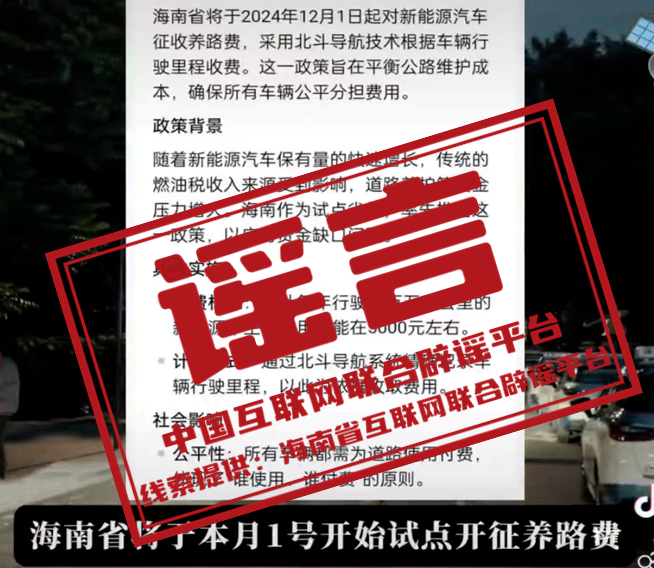 真相:近日,一些自媒體炒作“海南將于2024年12月1日起對新能源汽車征收養(yǎng)路費”的消息,引發(fā)關注。12月5日,海南省交通運輸廳工作人員回應稱相關消息是假消息。截至目前,海南從未發(fā)布過收取新能源車輛的車輛通行附加費相關政策。(來源:@海南網(wǎng)絡舉報、“海南省交通運輸廳”微信公眾號、南海網(wǎng))