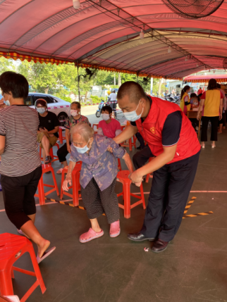 阜沙鎮(zhèn)綜合治理辦主任關(guān)國勝協(xié)助長者開展核酸檢測(cè)工作。