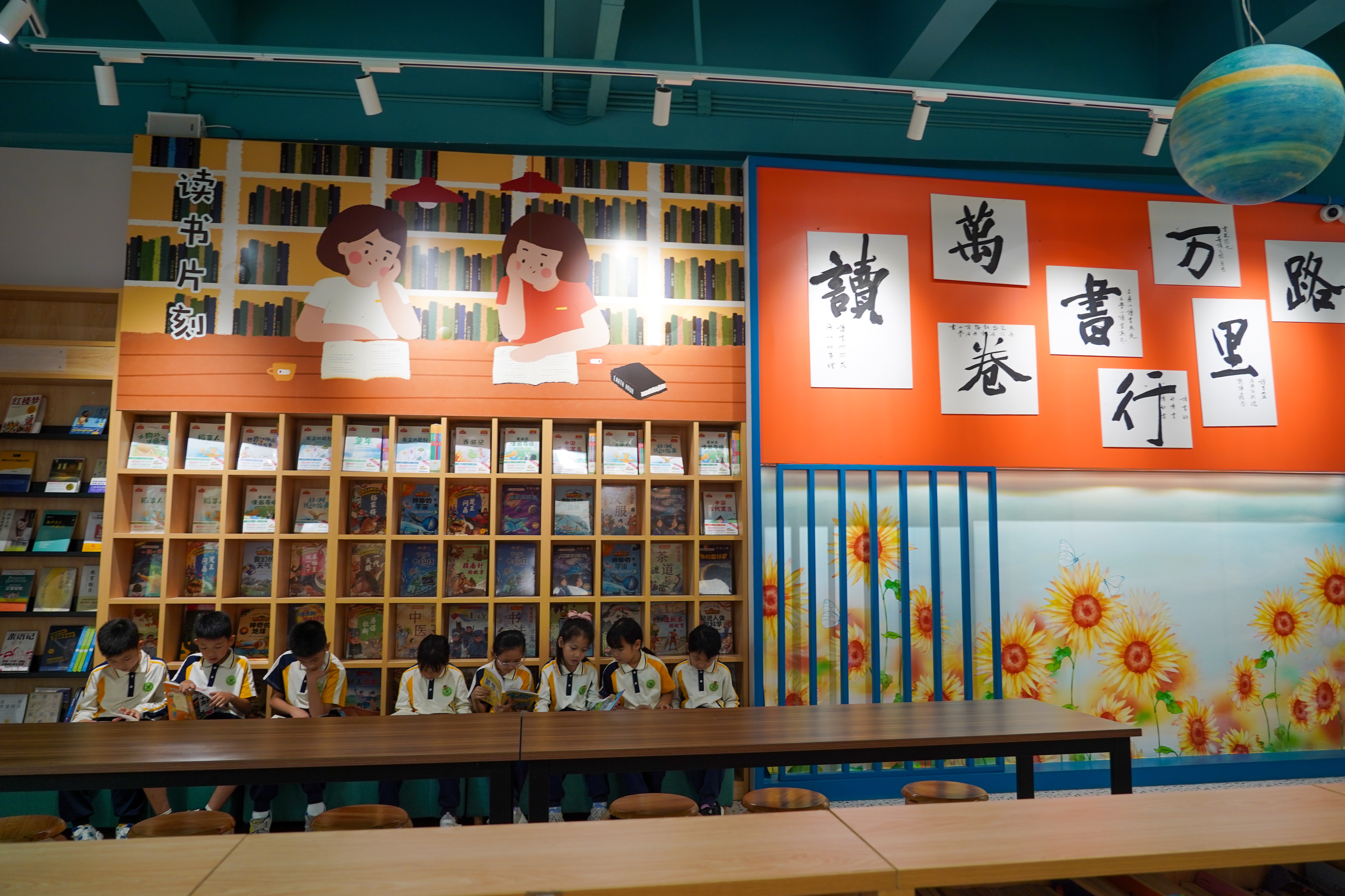 書屋的布局設計暗藏巧思,四大功能區(qū)域各有側(cè)重,滿足多元閱讀需求:靜讀區(qū)靜謐溫馨,造型別致的趣味桌椅與柔軟舒適的趴讀角,為孩子們打造了不受打擾的沉浸式閱讀空間。“第一次走進書房,我就被這里舒適溫馨的環(huán)境吸引了。鋪了軟墊的角落是我平常最愛待的地方,因為我可以坐在地上隨心所欲地閱讀。”五年級學生呂鈺婷的話語,道出了許多孩子對這里的偏愛。