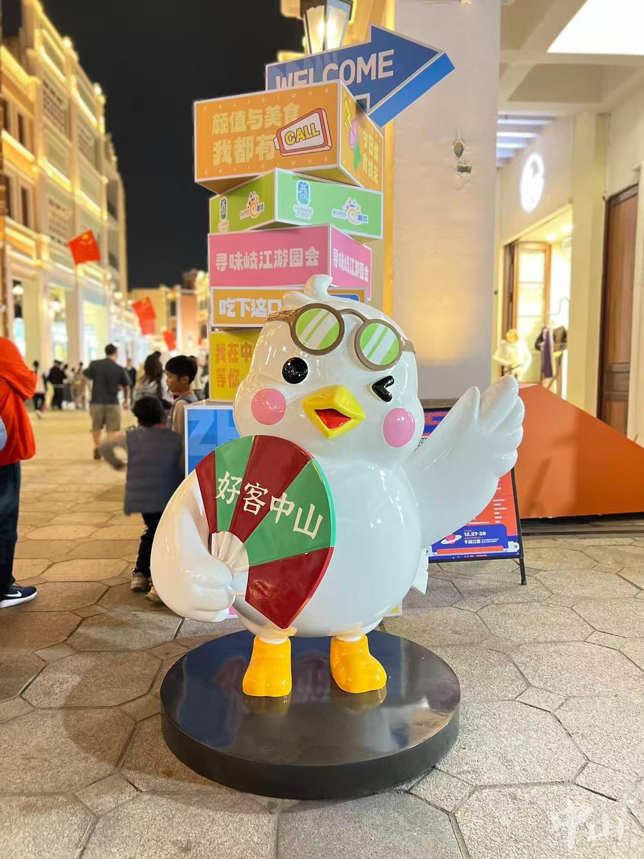 1月1日上午,在孫文西路步行街大廟下的小廣場(chǎng)處,以石岐乳鴿為原型、由廣東中山文旅集團(tuán)原創(chuàng)設(shè)計(jì)的巨型IP萌偶“好客小鴿”,非常醒目亮眼。造型活潑可愛的它,一下吸引了市民游客的目光,成為市民游客爭(zhēng)相合影的“新寵”。