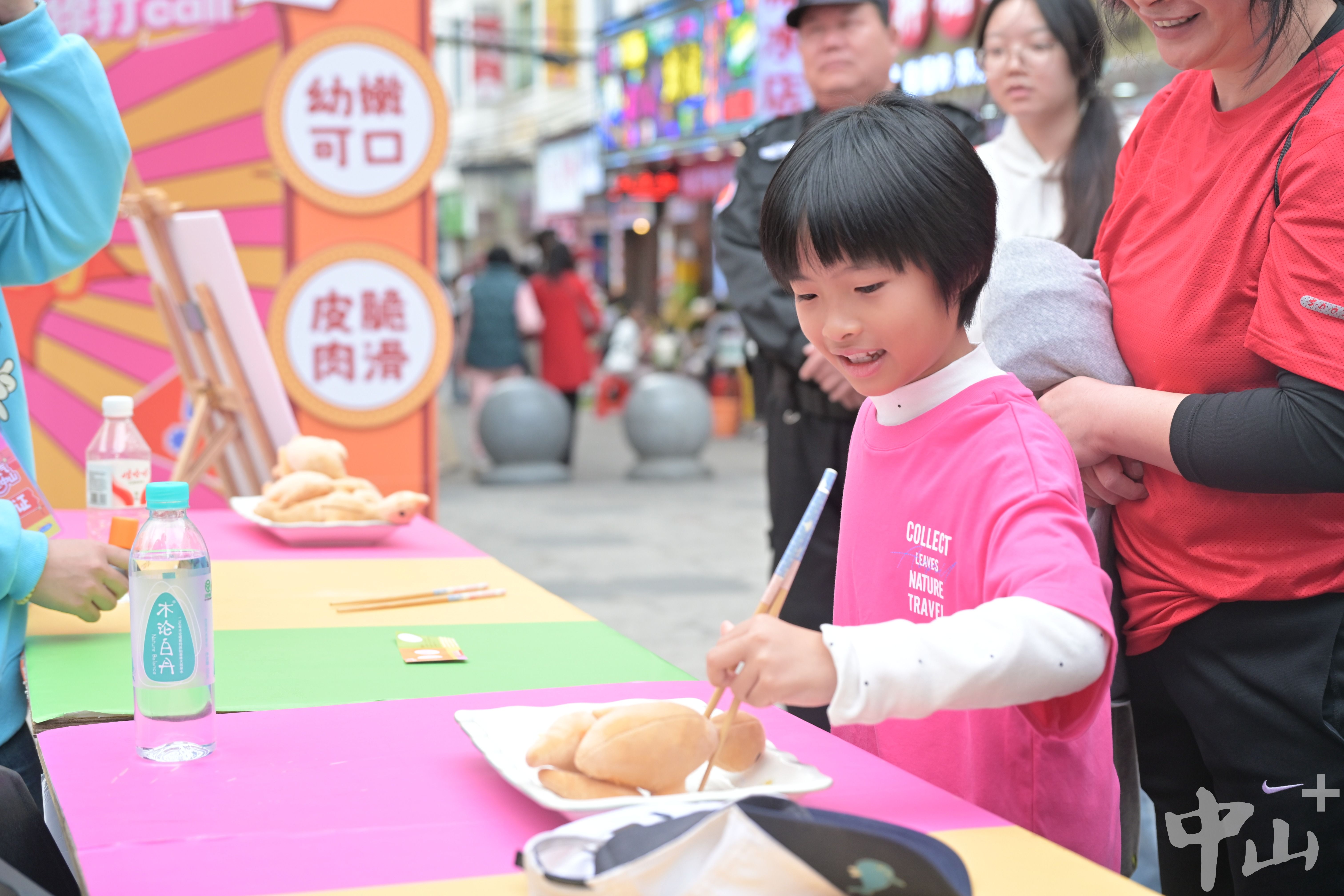 在“好客小鴿”旁邊,尋味岐江游園會(huì)“瘋狂夾乳鴿”“套鴿大作戰(zhàn)”等趣味游戲,正在火熱進(jìn)行,眾多大小朋友踴躍參與?!疤衾?,我都夾中了!”其中,在“瘋狂夾乳鴿”活動(dòng)中,參與者使用筷子,在30秒內(nèi)將5個(gè)公仔乳鴿都放置空盤中,完成挑戰(zhàn)即可通關(guān),不少小朋友們躍躍欲試,并在有趣的夾公仔乳鴿過(guò)程中,露出開心笑容。