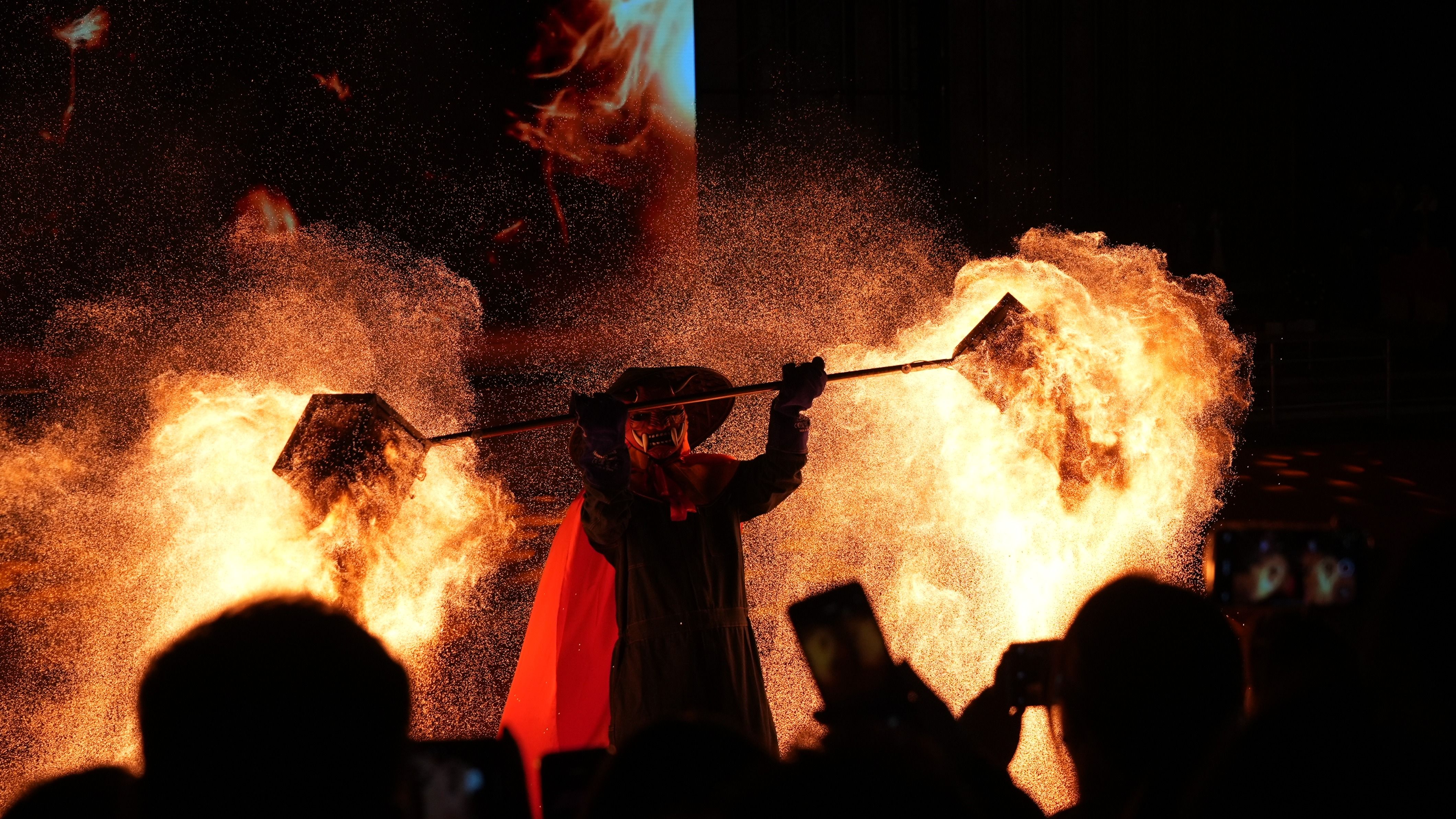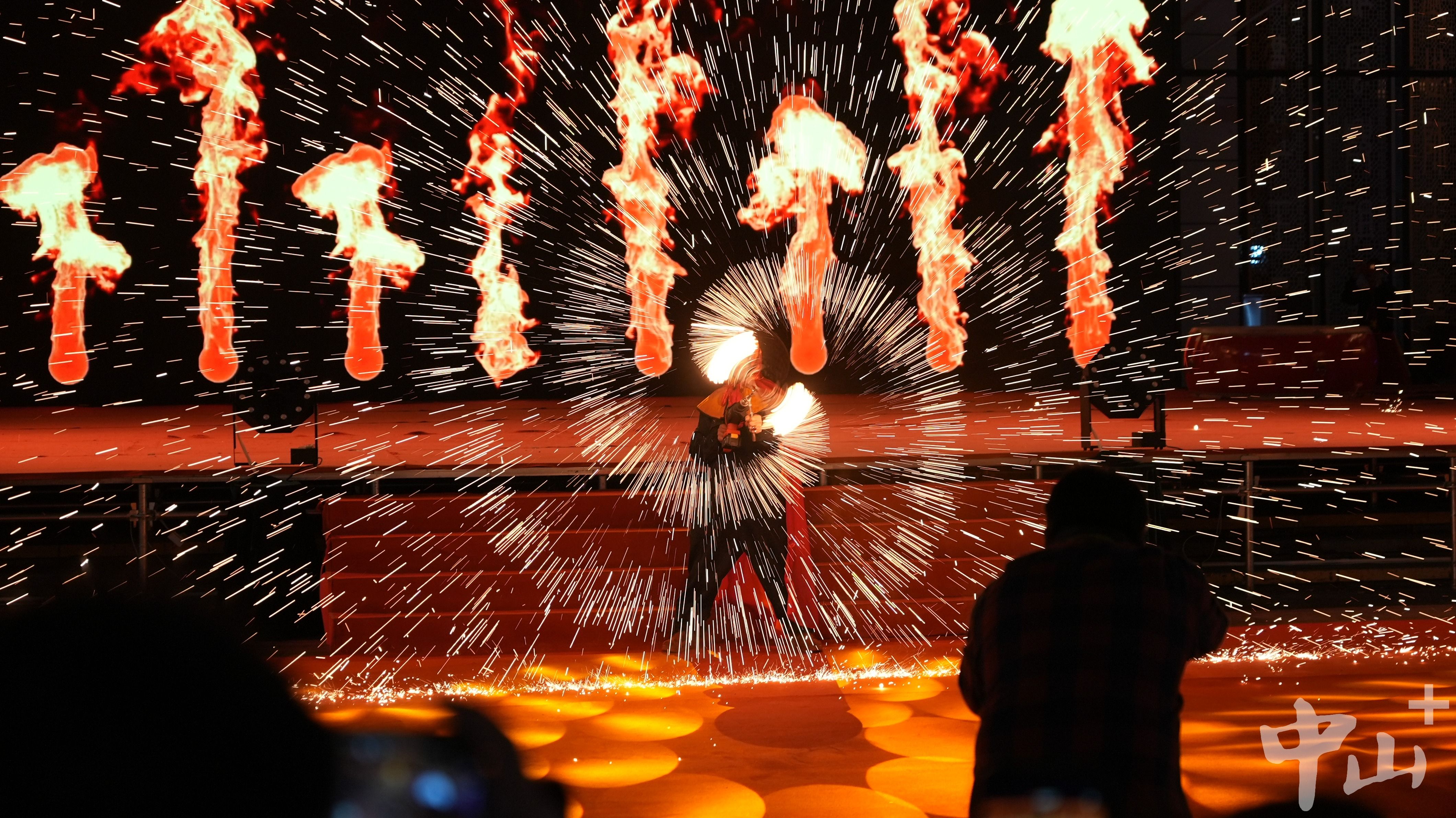 夜色漸深,非遺“火系列”表演驚艷登場,瞬間點(diǎn)燃了全場的熱情。掌握多種非遺技藝的表演者王雄亮身著特制護(hù)具,沉穩(wěn)托起四十斤重的火壺——抖、轉(zhuǎn)、拋、接一氣呵成,壺中800℃的熾炭凌空潑灑,化作萬千飛濺的星火。