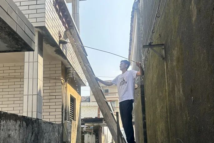“阿姨,您家樓頂積了水,容易孳生蚊蟲,得趕緊清掉。我們現(xiàn)在先幫您疏通一下排水口?!?在南朗街道蚊媒傳染病防控一線,左步村網(wǎng)格員、退伍軍人嚴(yán)兆雄跟村民溝通后,爬上長梯,用工具疏通天臺外墻排水口,讓積水迅速排走,從源頭阻斷蚊蟲孳生。