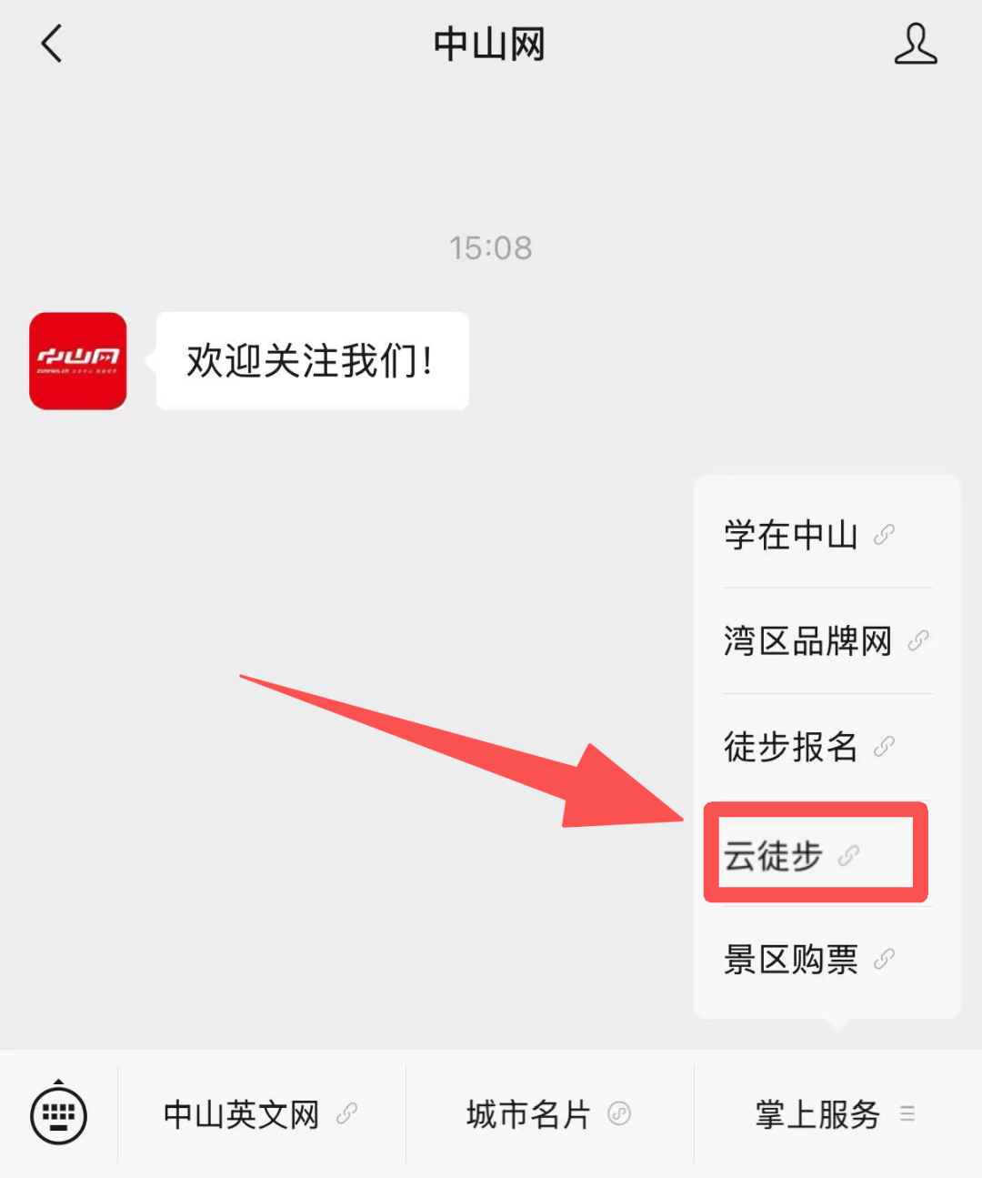 方式二:關(guān)注“中山網(wǎng)”微信公眾號(hào),點(diǎn)擊菜單欄-掌上服務(wù)-云徒步,開(kāi)展云徒步之旅。