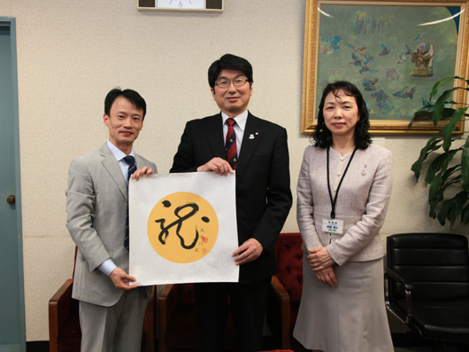 中山市教育考察團(tuán)成員向田上市長、馬場教育委員長展示中山市小學(xué)生作品