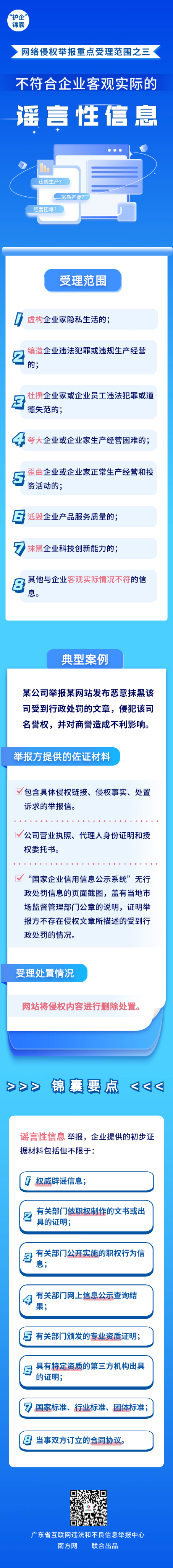 為有效助力企業(yè)維護自身網(wǎng)絡合法權益,廣東省互聯(lián)網(wǎng)違法和不良信息舉報中心精心準備了“護企”錦囊,結合案例帶大家了解涉企網(wǎng)絡侵權信息的重點受理范圍,今天推出重點受理范圍之三——不符合企業(yè)客觀實際的謠言性信息。