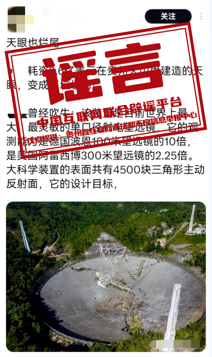 真相:近日,海外社交平臺(tái)有網(wǎng)民發(fā)布一張圖片,聲稱“耗資2.6億美元在貴州大山里建造的天眼,變成了垃圾場(chǎng)!”對(duì)此,“貴州辟謠”官方微信公眾號(hào)發(fā)布消息稱,網(wǎng)傳說法為謠傳,網(wǎng)傳圖片實(shí)為美國(guó)波多黎各的阿雷西博天文臺(tái)(Arecibo Observatory)于2020年12月發(fā)生徹底坍塌的畫面,該天文臺(tái)主要的觀測(cè)裝置為阿雷西博射電望遠(yuǎn)鏡。事實(shí)上,這并非“中國(guó)天眼”第一次“被坍塌”,2020年阿雷西博望遠(yuǎn)鏡第一次出現(xiàn)嚴(yán)重?fù)p壞之際,網(wǎng)絡(luò)中就曾出現(xiàn)過類似謠言。