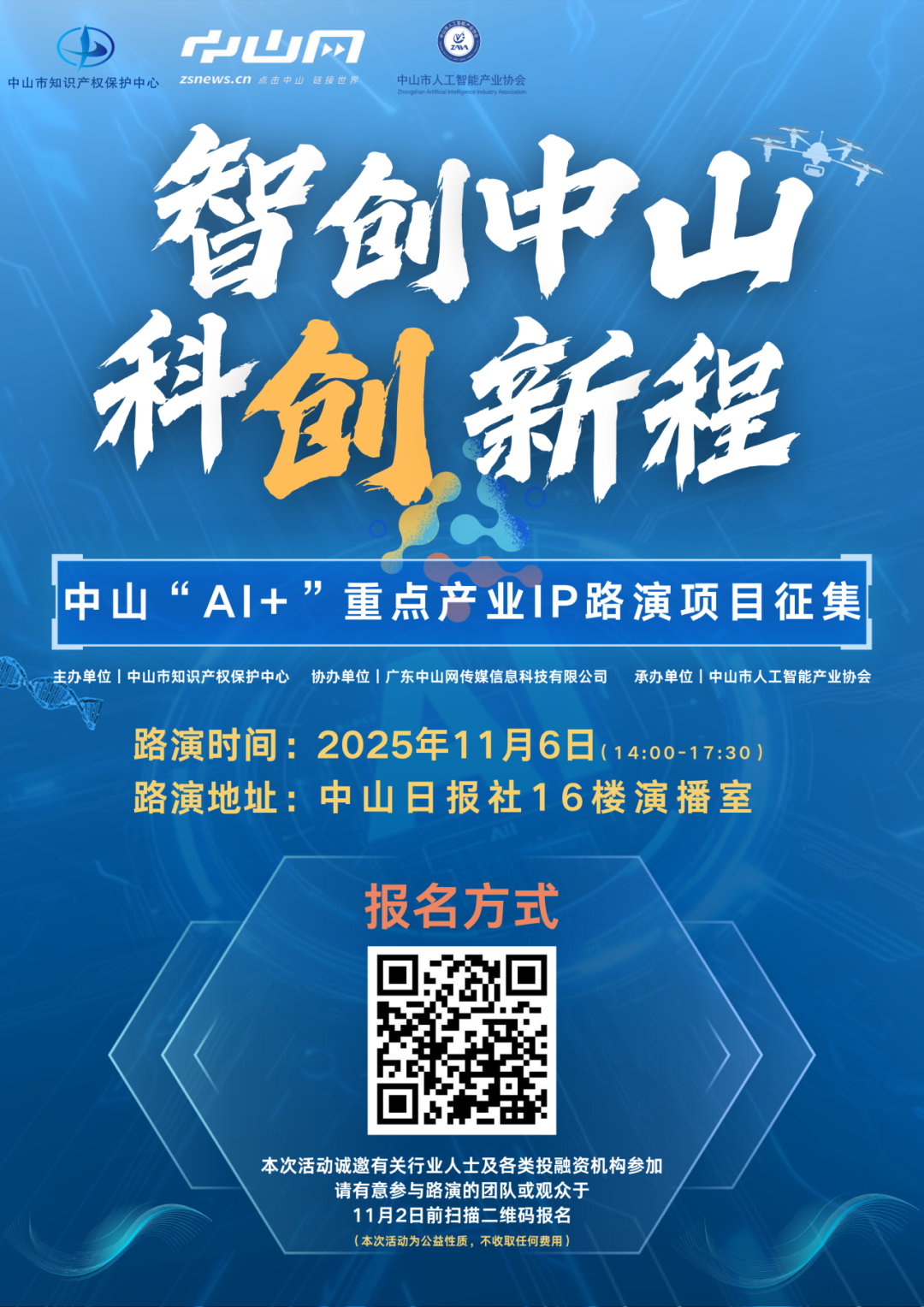 本次活動(dòng)誠(chéng)邀有關(guān)行業(yè)人士及各類投融資機(jī)構(gòu)參加,請(qǐng)有意參與路演的團(tuán)隊(duì)或觀眾,于11月2日前掃描以下二維碼報(bào)名。本次活動(dòng)為公益性質(zhì),不收取任何費(fèi)用。