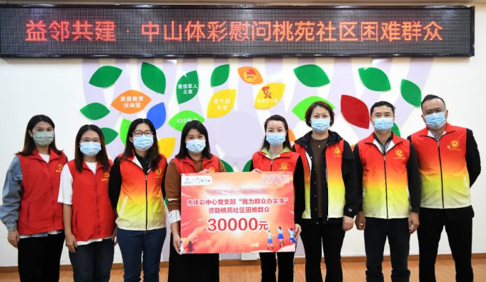 中山體彩黨支部向桃苑社區(qū)困難群眾捐贈現(xiàn)場。